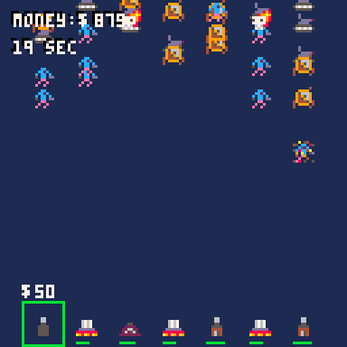- Scattershot - Fires very fast, hits a wide area and is very cheap but damage is weak and range is short. Costs $50 to build.